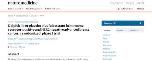 11月4日,国际四大医学期刊之一、英国《自然》旗下《自然医学》(Nature Medicine)在线发表CDK4/6抑制剂达尔西利(SHR6390)联合氟维司群治疗既往内分泌治疗后疾病进展的HR+/HER2-晚期乳腺癌的多中心、随机、双盲III期临床研究(DAWNA-1研究)中期分析结果报告,首次对氟维司群(雌激素受体降解剂)±达尔西利治疗激素受体阳性晚期乳腺癌的有效性和安全性进行了比较。研究结果显示,达尔西利+氟维司群组与安慰剂+氟维司群组相比,无进展生存期(PFS)显著延长。该项研究由中国医学科学院肿瘤医院徐兵河教授担任leading PI,全国39家医院参研,由918搏天堂临床研发团队支持完成。