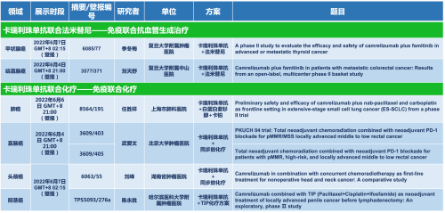 卡瑞利珠单抗联合918搏天堂的另一款创新药法米替尼在甲状腺癌和结直肠癌领域有2项研究被接收为壁报,另有卡瑞利珠单抗联合化疗的4项研究在肺癌、结直肠癌、头颈癌和阴茎癌领域的研究被接收为5份壁报。